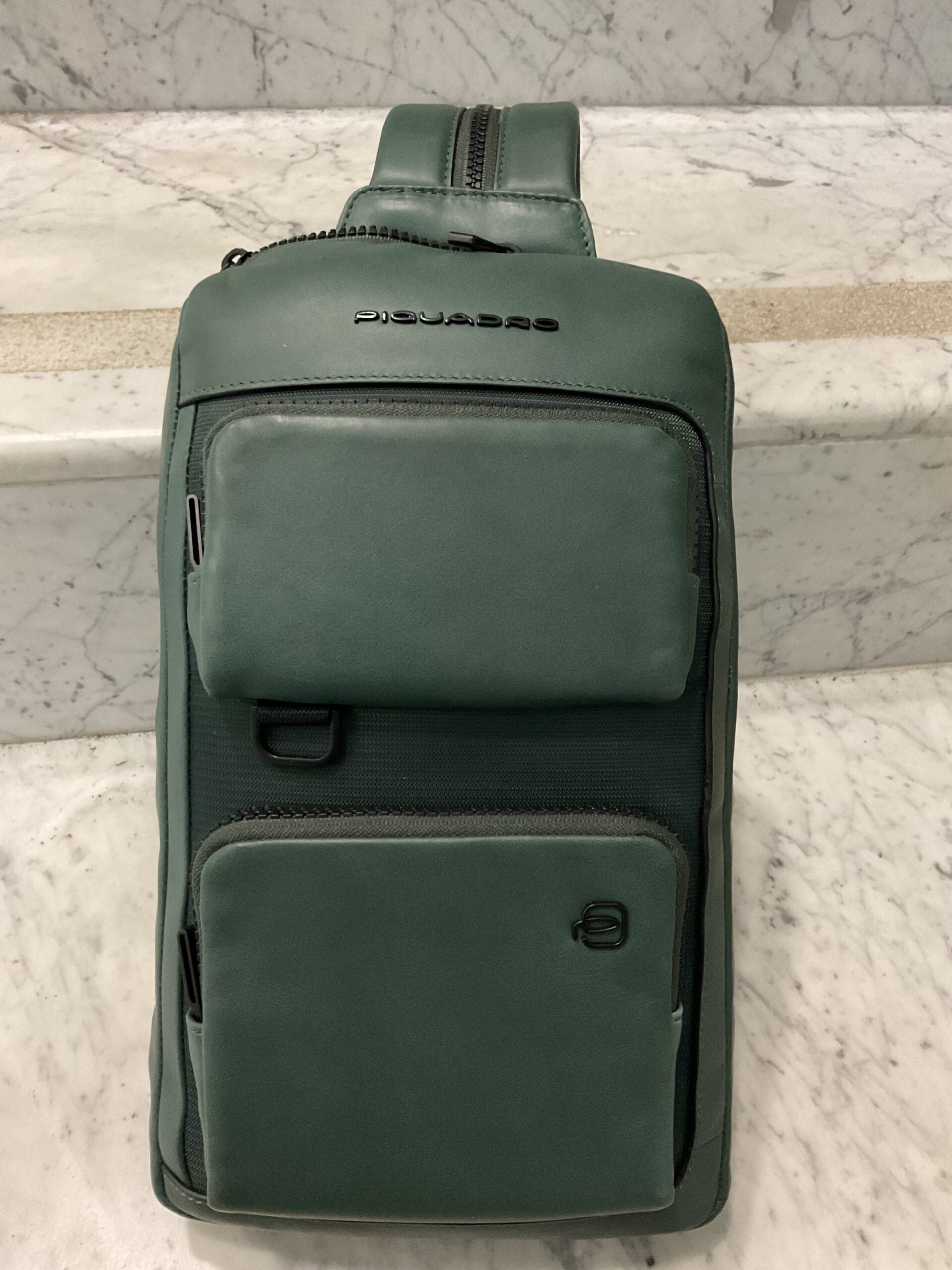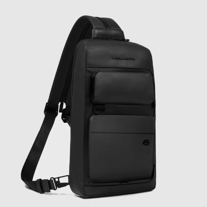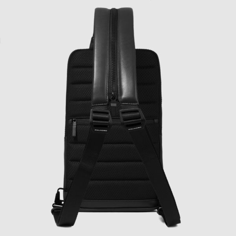 Zaino monospalla uomo in tessuto riciclato e pelle porta iPad®, schermato con protezione anti frode RFID